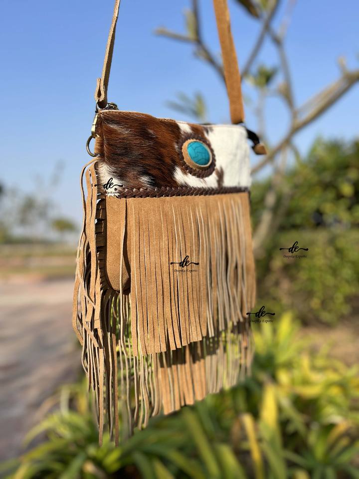 Hot Sale Cowhide Fur Leather Fringe Handbag Turquoise Stone Sling Bag Multi Uses Stylish Bags Bohemian Stylish Tassel Fringe Bag