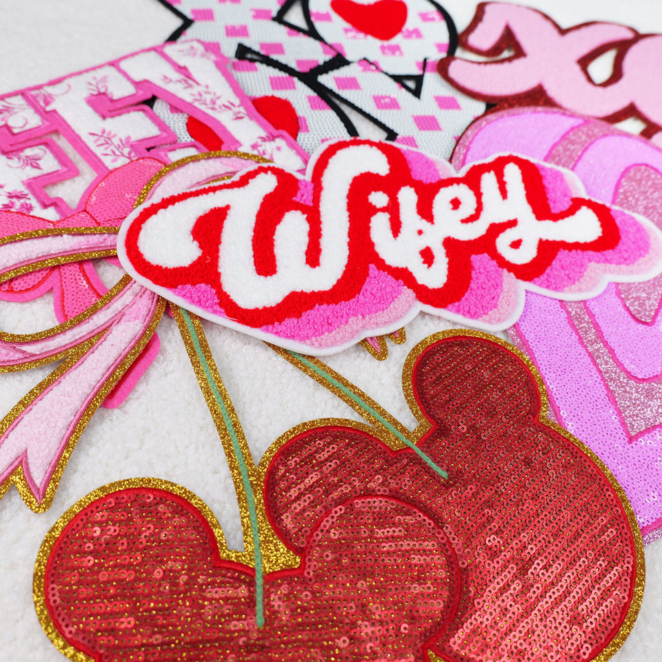 Hot Sale Custom Valentine Day Glitter Letter Heart Patch Wife/Love/Wifey/Be Mine Iron on Chenille Patches
