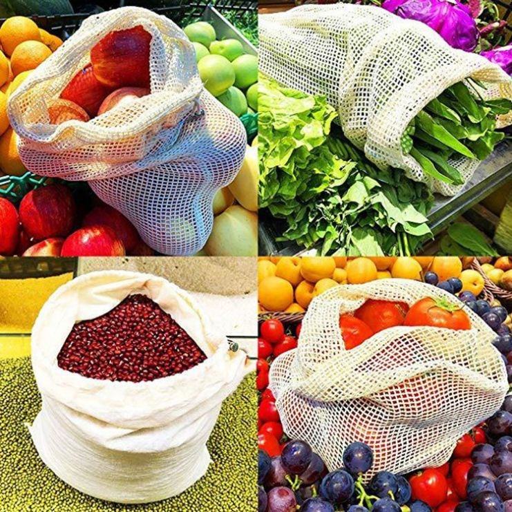 Hot Sale Customized Color Organic Cotton Reusable Produce Bags Net Mesh Bag Patch Folding for Fruit Vegetables Drawstring