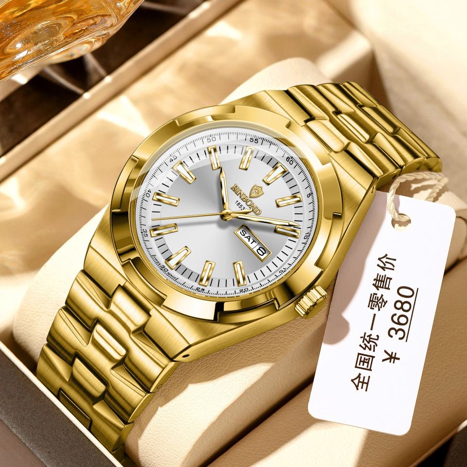 Hot Sale Gold Fashion Casual Luxury Quartz Watches Men Alloy Case Stainless Steel Band Dual Calendar Week Business 40mm Glass