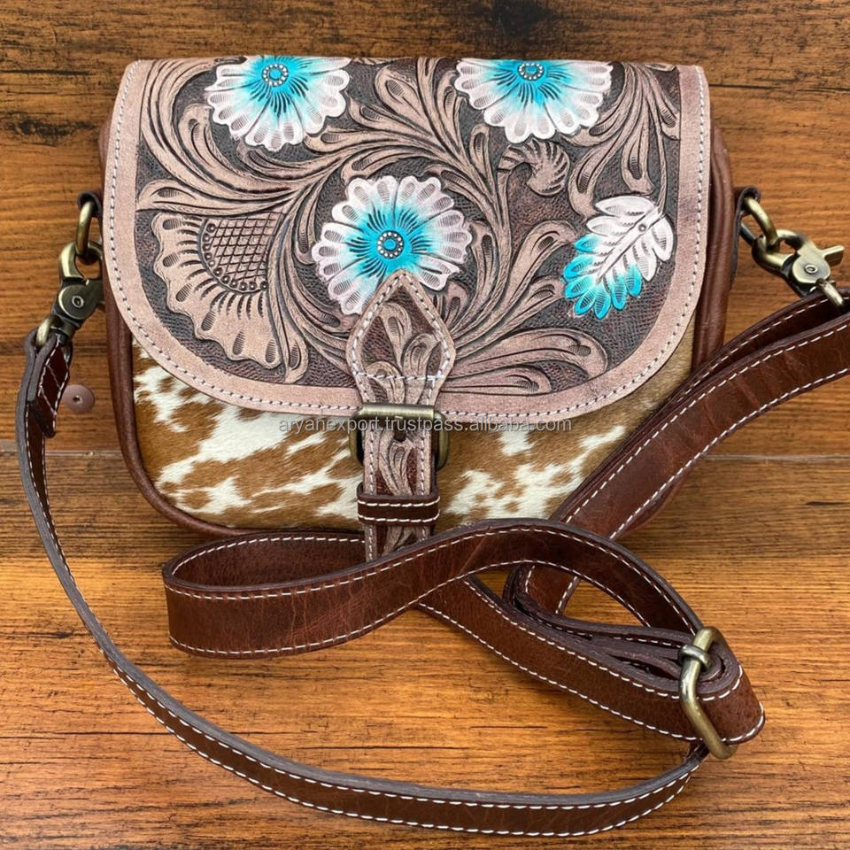 Hot Sale Hair on & Hand Tooled Leather Crossbody Bag Luxury Turquoise Floral Purse Carved Genuine Leather Women Western Handbags