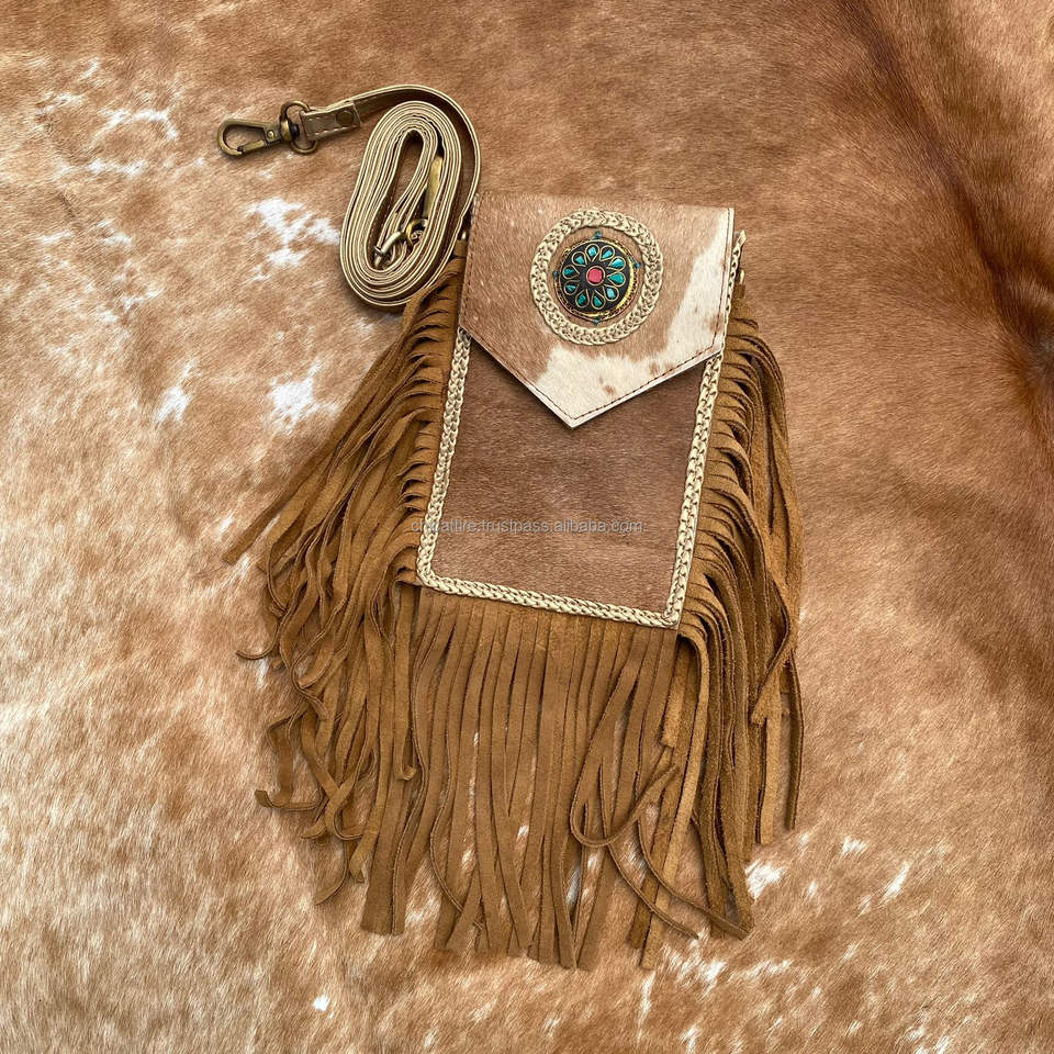 Hot Sale Handmade Hair on Cowhide Large Fringe Crossbody Mobile Bag for Women's Western Genuine Leather Concho Cell Phone Purse