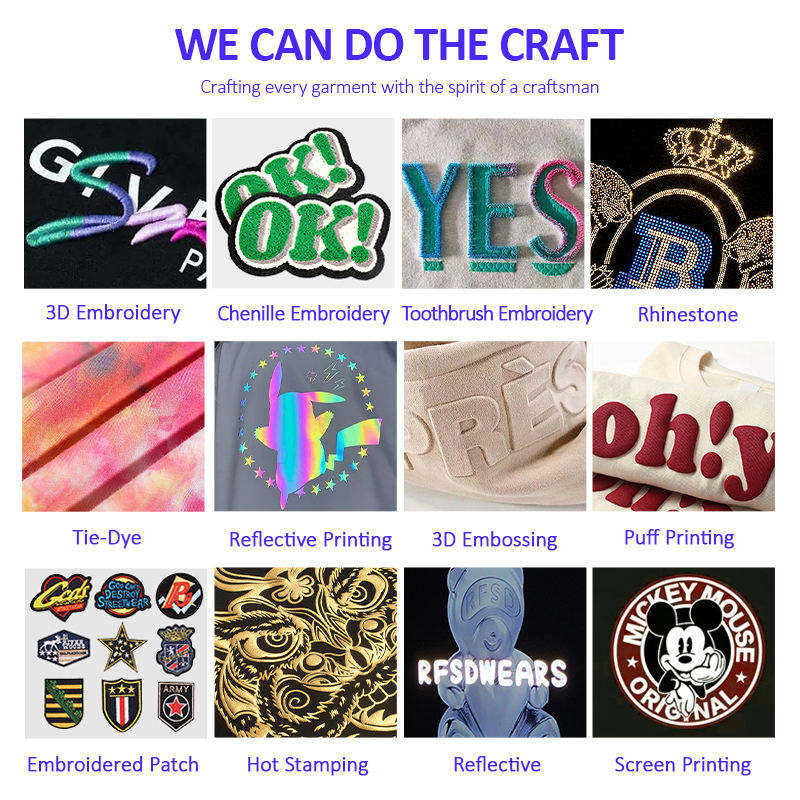Technics:Embroidered, Printed, Washed, Puff Print, Flocking, 3D embroidery, Flocking embroidery, Rhinestone, towel embroidery, Applique, plain embroidery