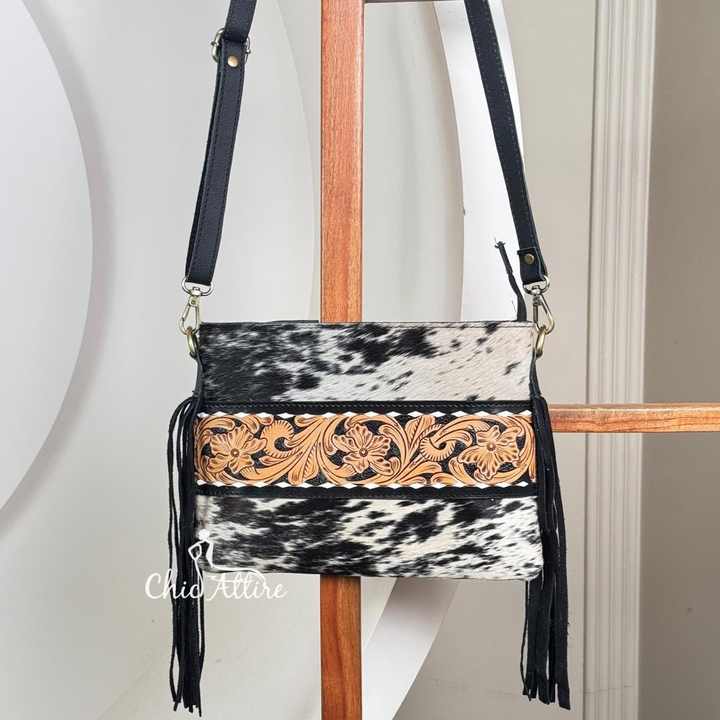 Hand Tooled Cowhide Leather Fringe Crossbody Bag