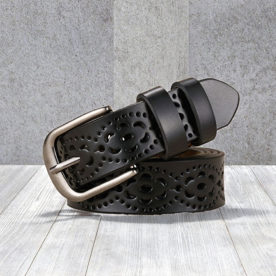 Hot Sale Ladies Vintage Genuine Leather Waist Belt Hollow Flower Design Metal Alloy Buckle Casual & Fashion Accessory