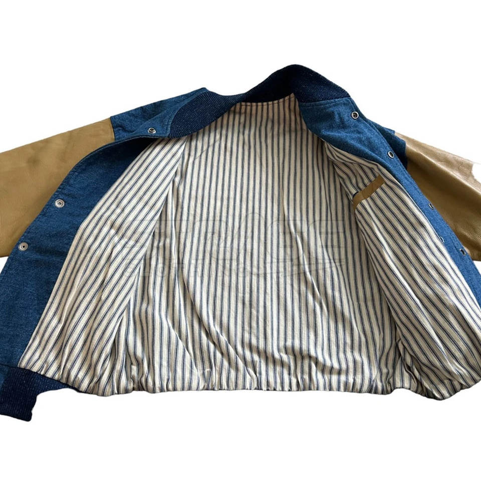 Hot Sale Winter Leather Jeans Varsity Jacket with Front Logo Durable Eco-Friendly Material and Bold Two-Tone Athletic Styling