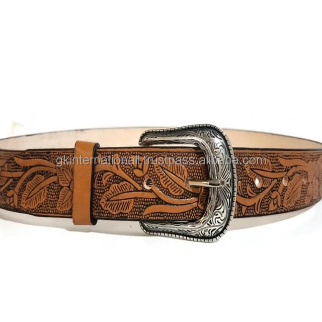 Hot Sale New Arrival Men's Fashion Western Leather Tooling Belt with Stylish Engraving Cowboy Buckle Belt at Low Price