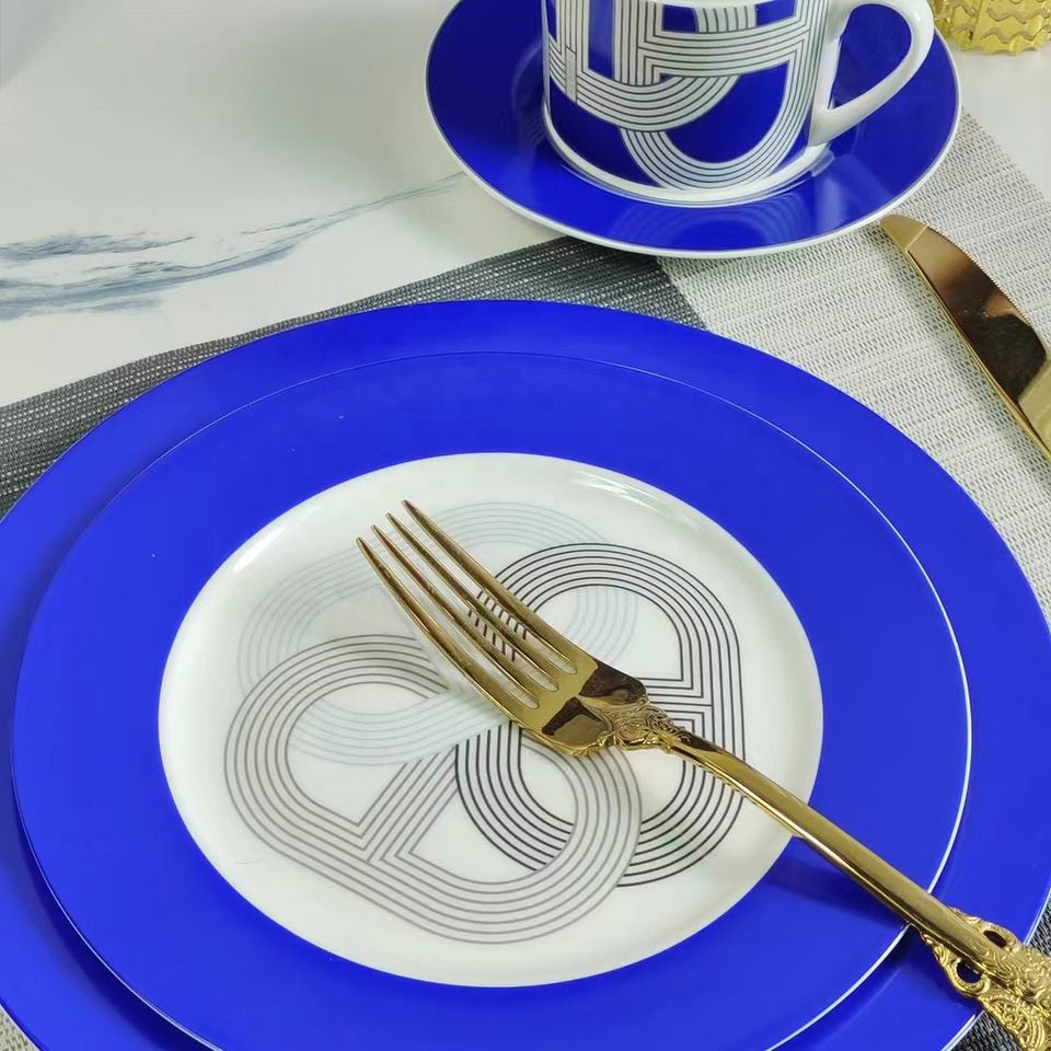 Hot Sale Nordic Luxury Bohemian Design 2pcs Blue Runway Porcelain Plate Set with Gift Box for Restaurant