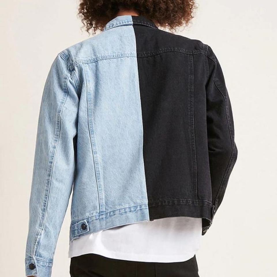 Hot Sale OEM Sevice Mens Half Spliced Blue Black Color Block Patchwork Two-tone Bomber Denim Jeans Jacket for Male