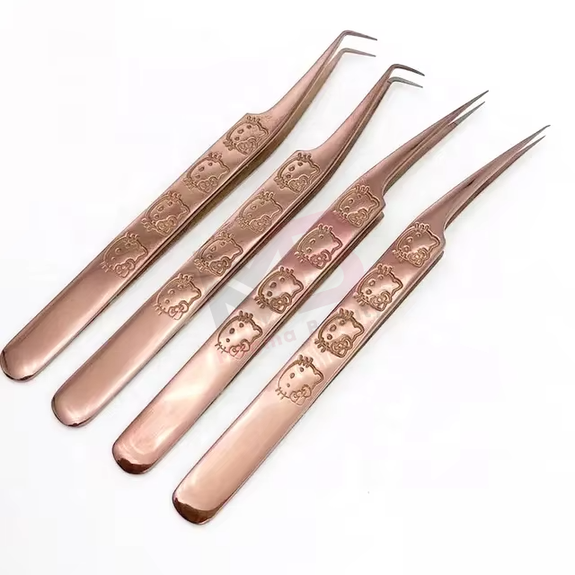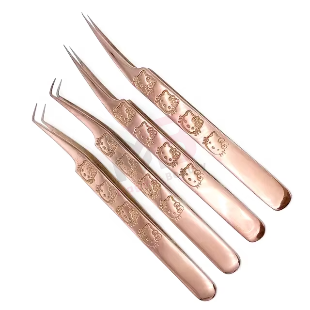 Hot Sale Professional Rose Gold Color Hello Kitty Lash Tweezers for Eyelash Extension Stainless Steel Smooth Tip