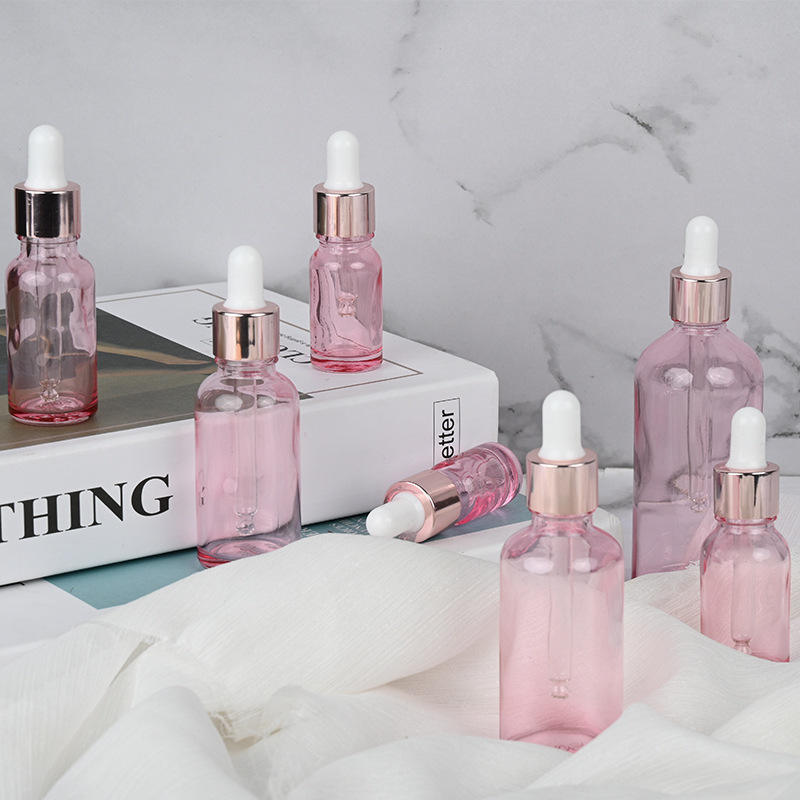 Hot Sale Skin Care Cylinder Rose Gold Serum Bottle 5 10 15 20 30 50 100ml Pink Shine Glass Dropper Bottle for Essential Oil