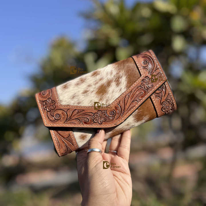 Hot Sale Stylish Cowhide Fur Clutch Hand Tooled Carving Leather Wallet for Women Multi-Use Western Leather for Summer