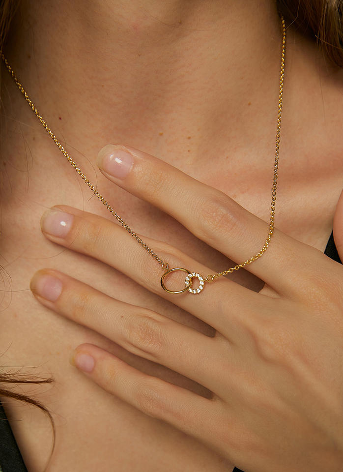 Hot Sale Stylish Trendy Double Circle Charm Necklace 18K Gold Plated Link Chain Crystal Brass Design Zircon Weddings Gift Giving