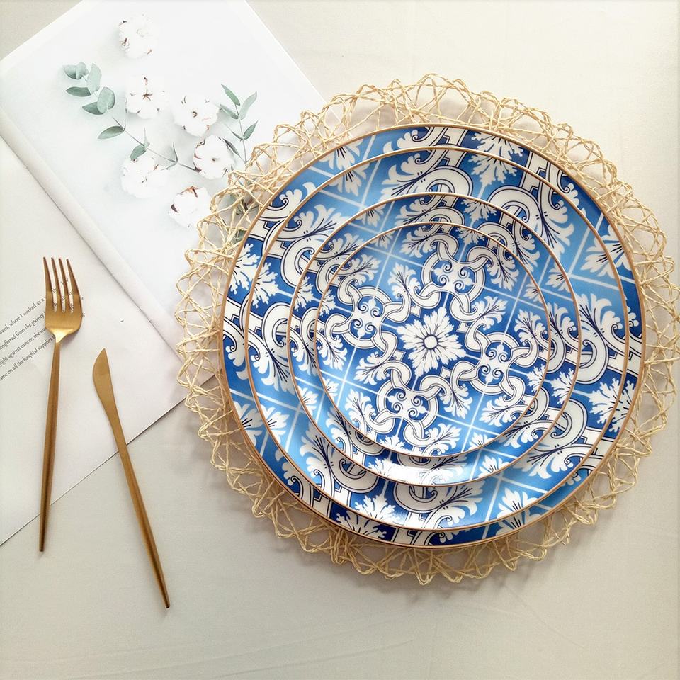 Hot Sale Utensils Porcelain Bone China Dinner Sets Ceramic Plates White Blue Wedding Event Plates Porcelain Plates