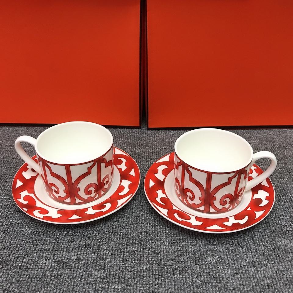 Hot Sale Western Restaurant Bone China Classic Design Eco-Friendly 250mL Red Wrought Iron Patterned Coffee Cup Saucer Model