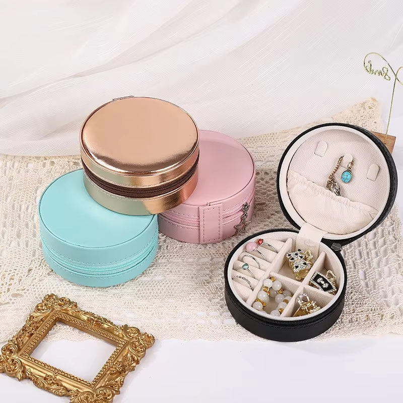 Hot Sale Wholesale Portable Round Hard Core Box Jewelry Display Ring Storage Packaging Zipper Case Small Cute Travel PU Leather