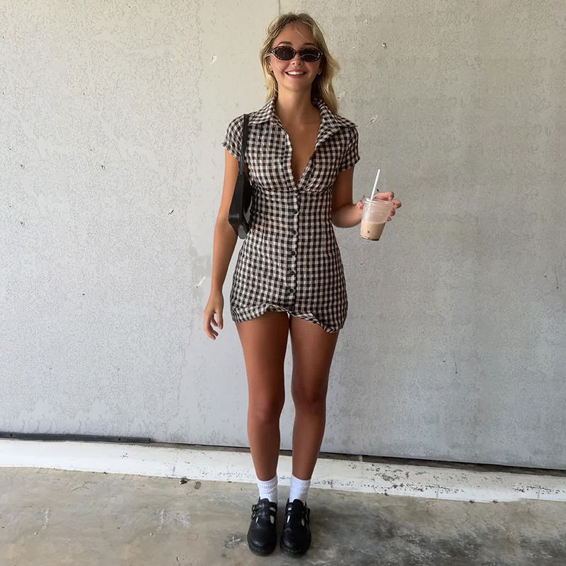 Hot Sale Women's Eco-Friendly Vintage Classic Plaid Mini Shirt Dress 100% Polyester Natural Smocked Waist Contrast Trim Button
