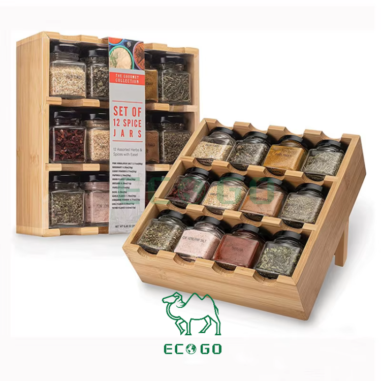 Hot Selling 12-cube Jars Stand Rack Bamboo Spice Jar Rack High Quality 3 Tiers Bamboo Kitchen Organizer Set Freestanding