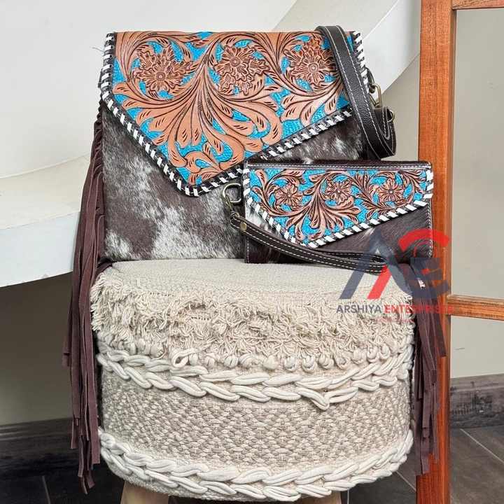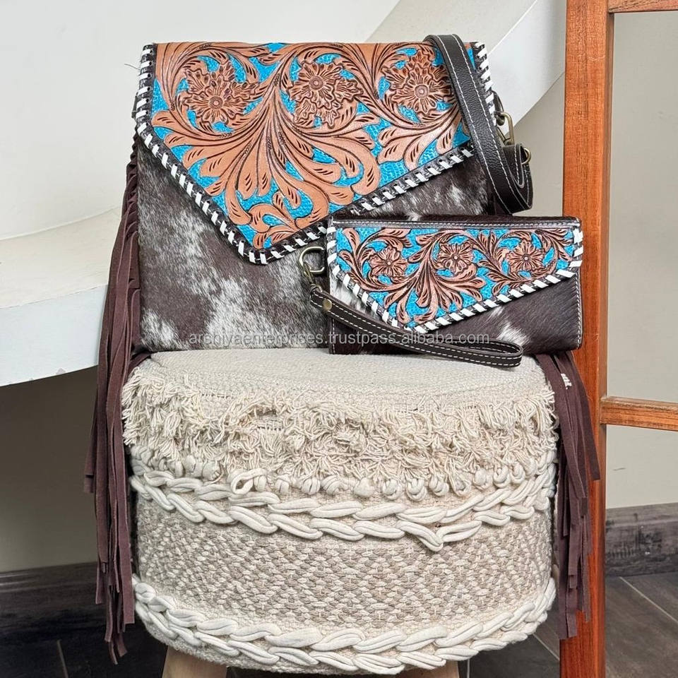 Hot Selling 2025 New Women Hand Tooled Cowhide Leather Fringe Crossbody Bag & Card Holder Clutch 2-Piece Combo Sets for Women's