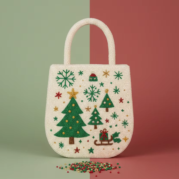 Hot Selling Beaded Winter Forest Handbag Intricate Evergreen Motif Glass Bead Zipper Closure Satchel High-End Wedding Statement