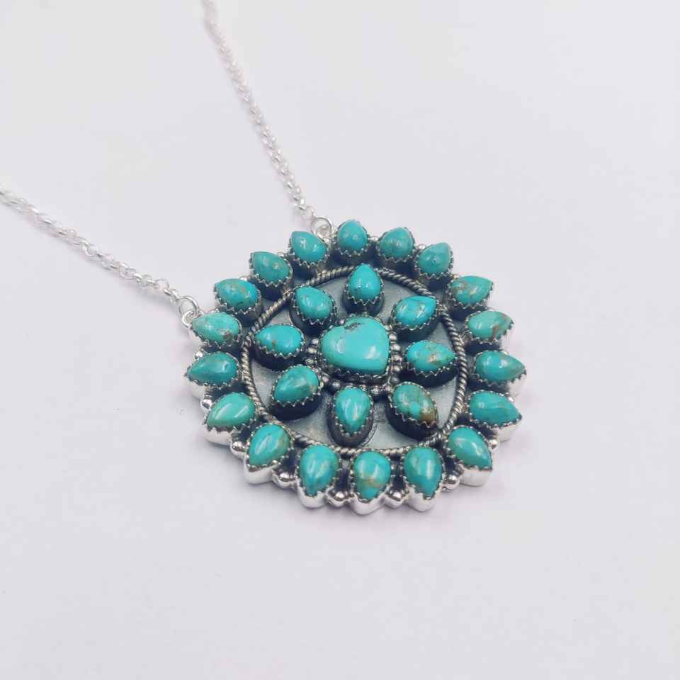 Hot Selling Beautiful Natural Kingman Arizona Turquoise Sun Flower Shape Customize Size Squash Blossom Navajo Bar Necklace