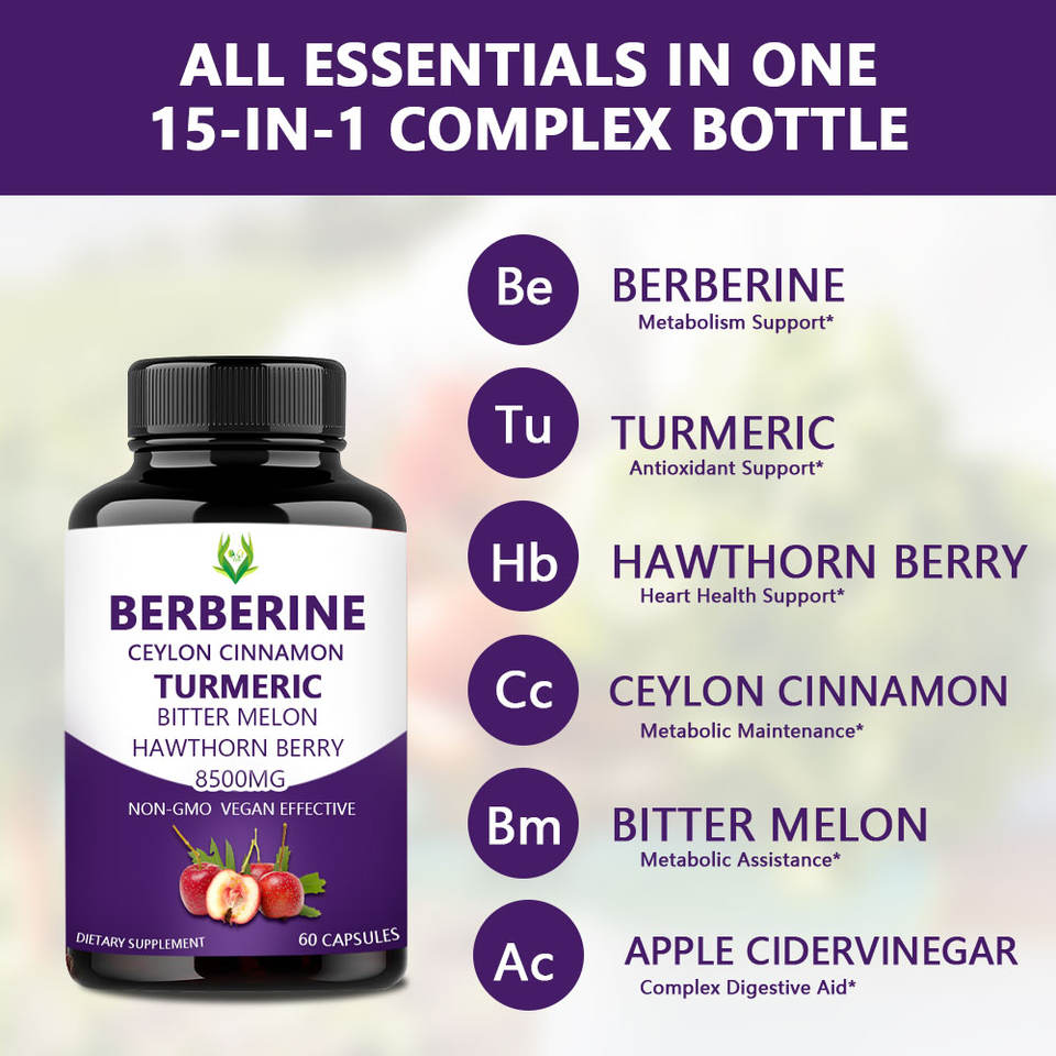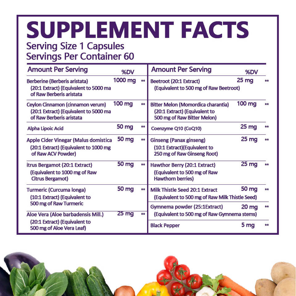 Berberine, Ceylon Cinnamon, Alpha Lipoic Acid, Apple Cider Vinegar, Itrus Bergamot, Turmeric, Aloe Vera, Beet Root, Bitter Melon, Coenzyme Q10, Ginseng, Hawthorn Berry, Milk Thistle Seed Extract, Gymnema Powder, Black PepperMain Ingredient