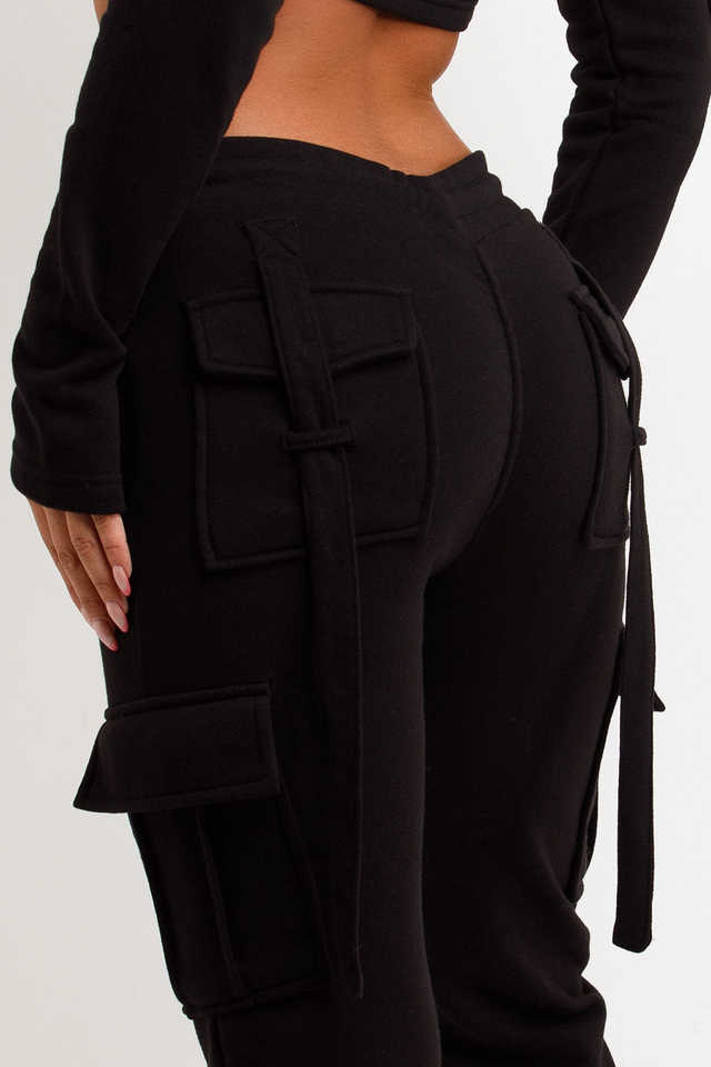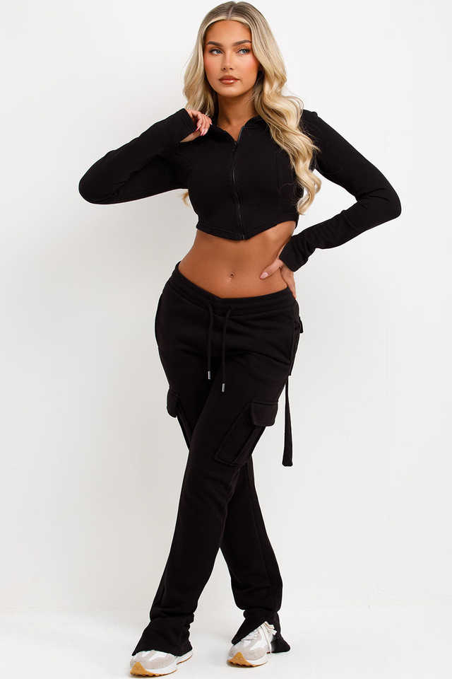 Hot Selling Black 2 Piece Women's Cargo Joggers & Crop Corset Hoodie Tracksuit Set Oversize Women 2 Piece Jogger Sweatpants Set