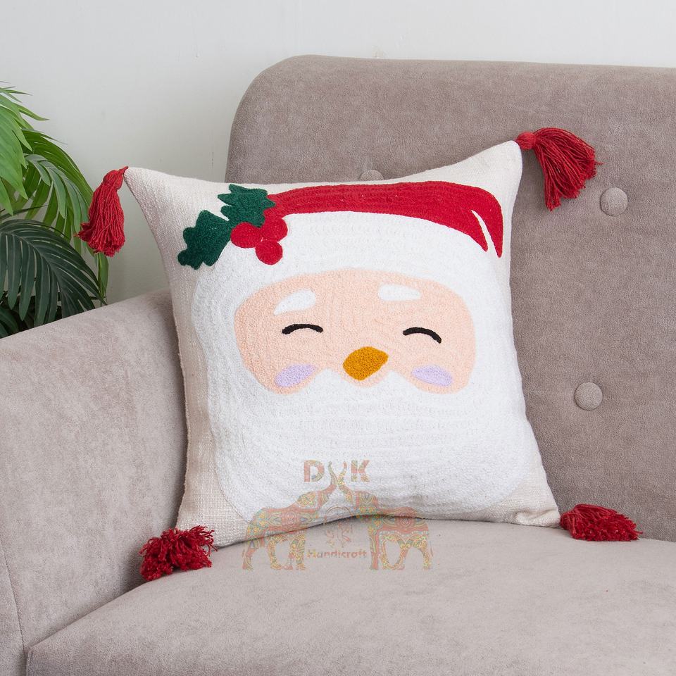 Hot Selling Christmas Santa Claus Pattern Embroidery Tufted Cushion Cover With Tassels Sofa Living Room