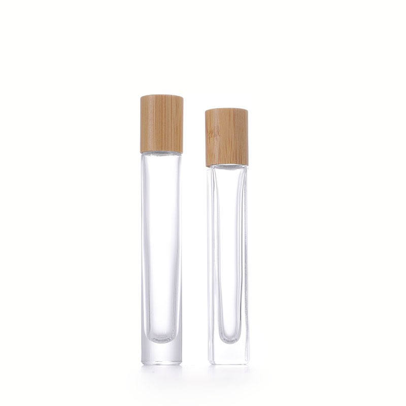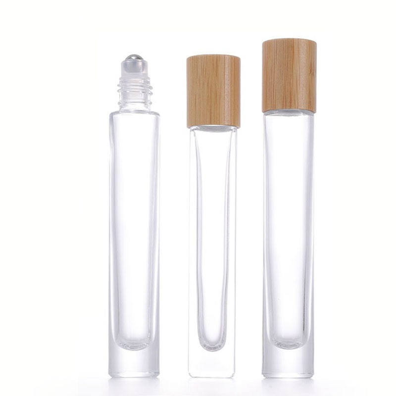 Hot Selling Clear Essential Oil Glass Roll on Bottle 10ml Rectangle Cylinder Bamboo Cap Lip Oil Roller Bottle with Metal Ball