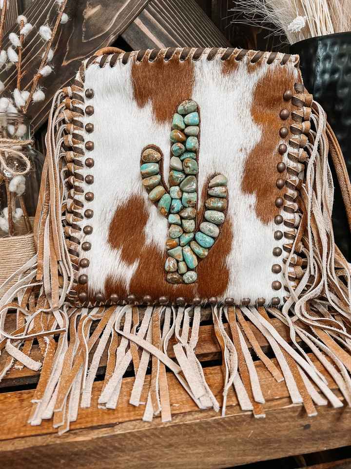 Hot Selling Cowgirl Western Cowhide Hair on Women's Luxury Sling Bag With Hand Tooled Floral & Stone Beaded Designs Cactus