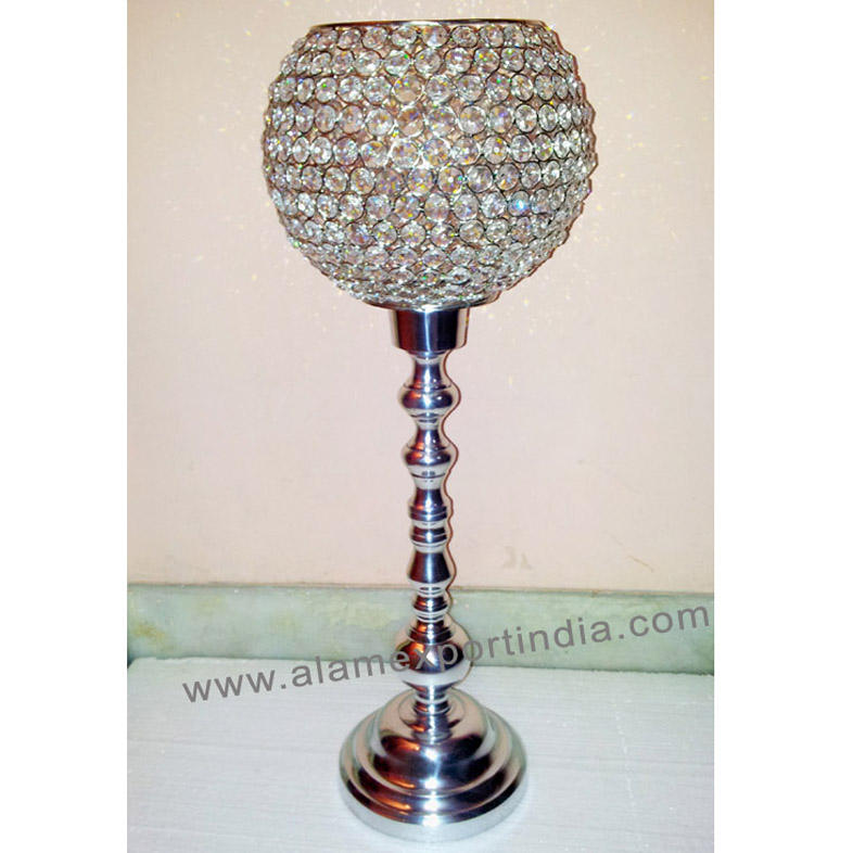 Hot Selling Crystal Beads Candle Holder Clear Crystal Bowl Round Candle Holder in Centerpiece Metal Aluminum Silver Finished