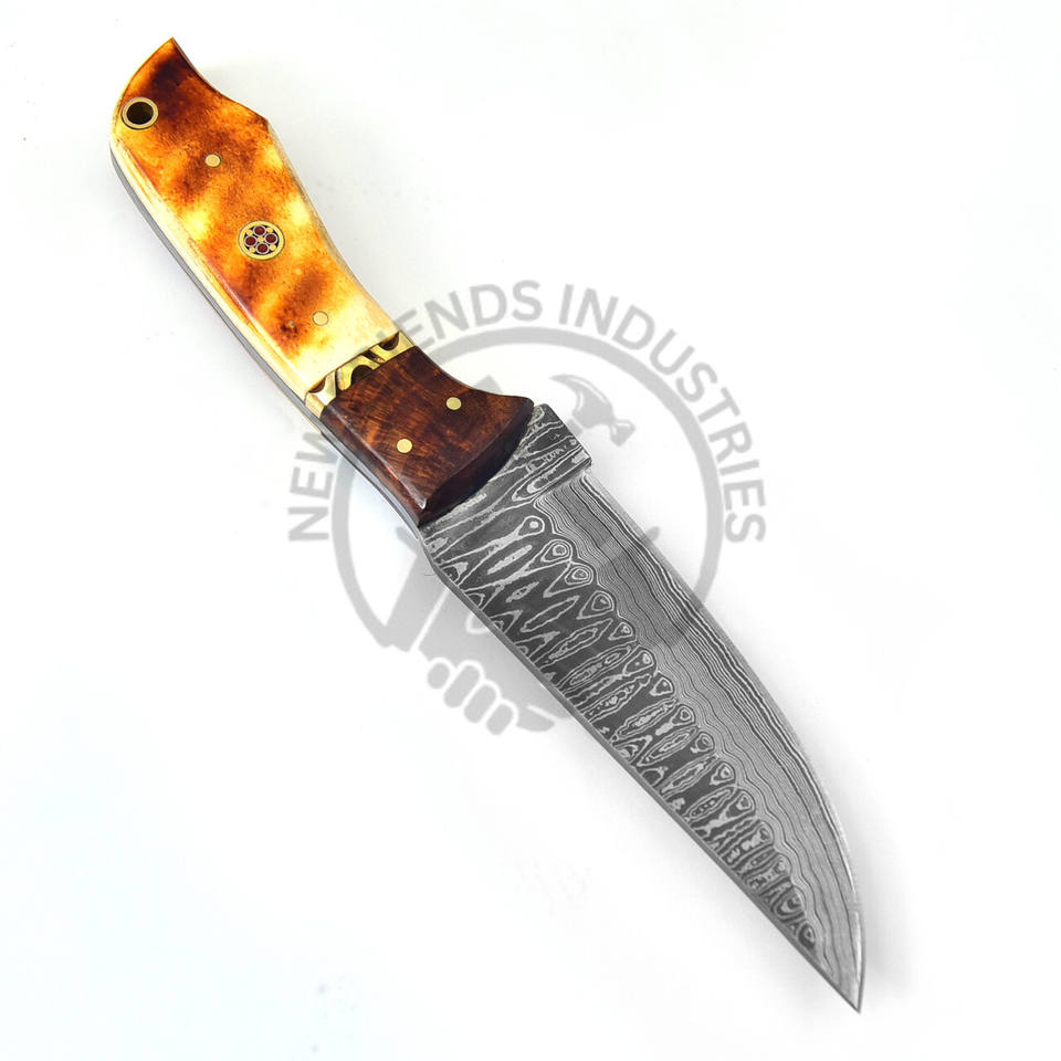 Hot Selling Custom Handmade Abandoned Pyre Fixed Blade Damascus Steel Outdoor Hunting Knife OEM/ODM Burn Camel Bone Walnut Wood