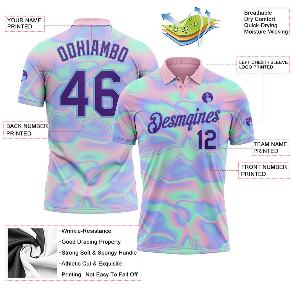 Hot Selling Custom Light Blue Purple 3D Pattern Design Abstract Trendy Holographic Vaporwave Style Performance Golf Polo Shirt