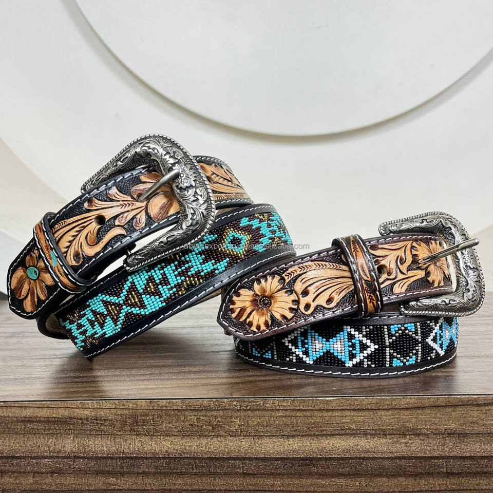 Hand Tooled Leather Beaded Pin Buckle Belt