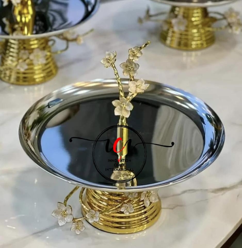 Hot Selling Eco-Friendly Nikil Gold Finished Textured Glass Cake Stand Bowl with Tray for Home Restaurant Wedding Use