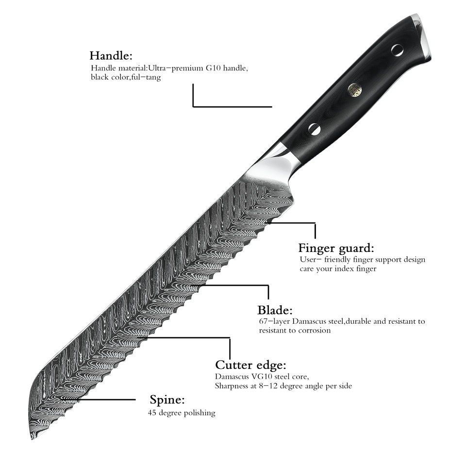 Hot Selling Edge Guard Serrated Bread Knives G10 Handle Damascus Blade Bread Cutter Handmade Dishwasher Safe Ambidextrous Easy