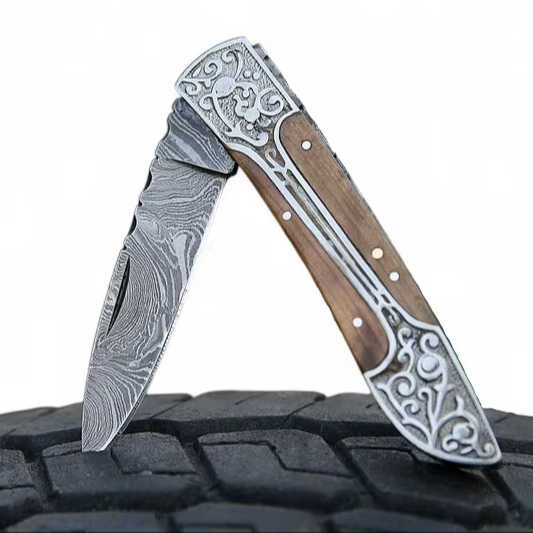 Hot Selling Hand Engraved OEM OBM Damascus Steel Folding Knife Wood Epoxy Handle Drop Point Flat Edge Slide Blade EDC Camping