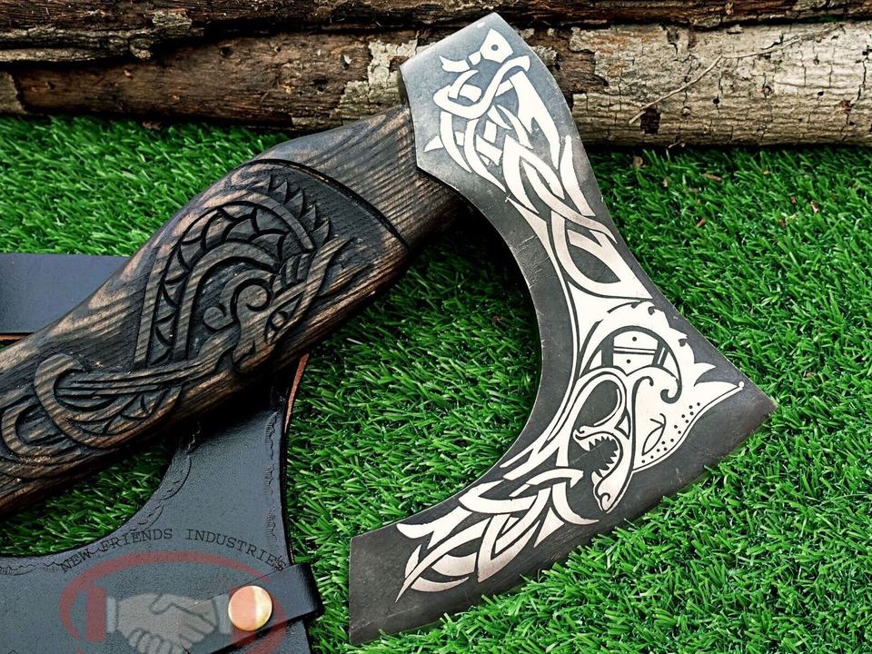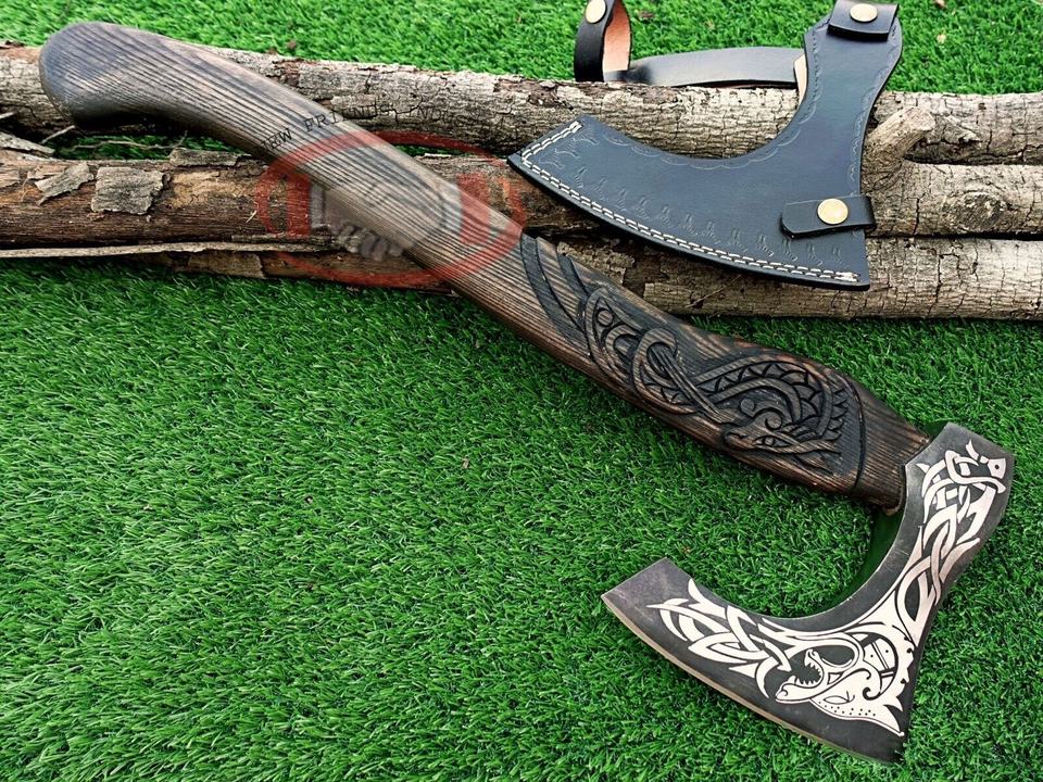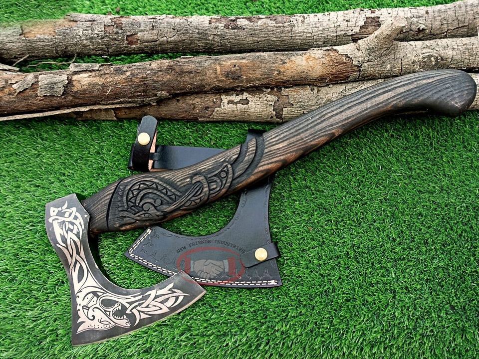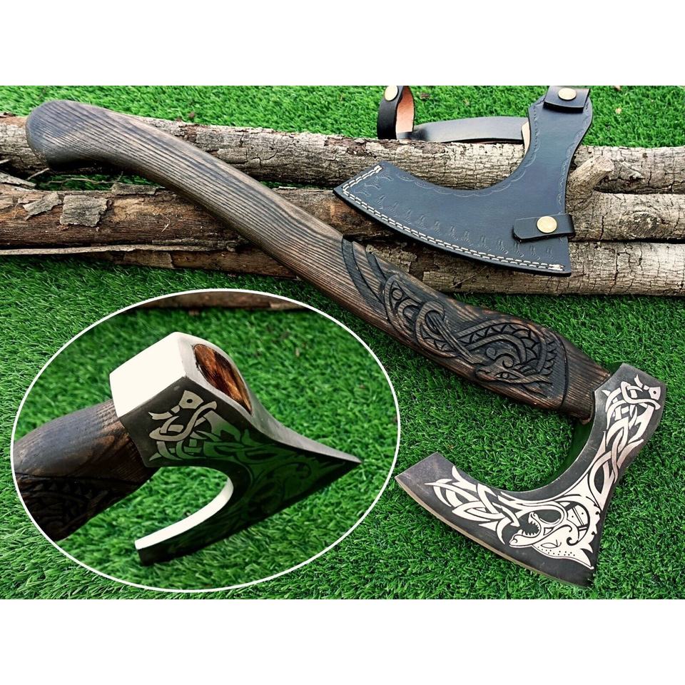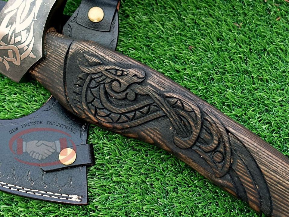 Hot Selling Hand-Foraged Damascus Steel Axe Bearded Axe Head Viking Survival Hatchet Featuring Wood Handle Engraved Leather