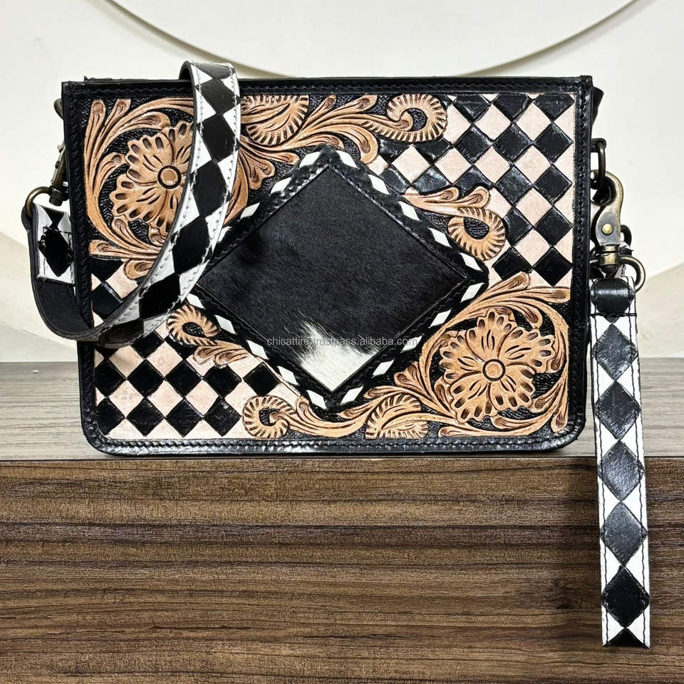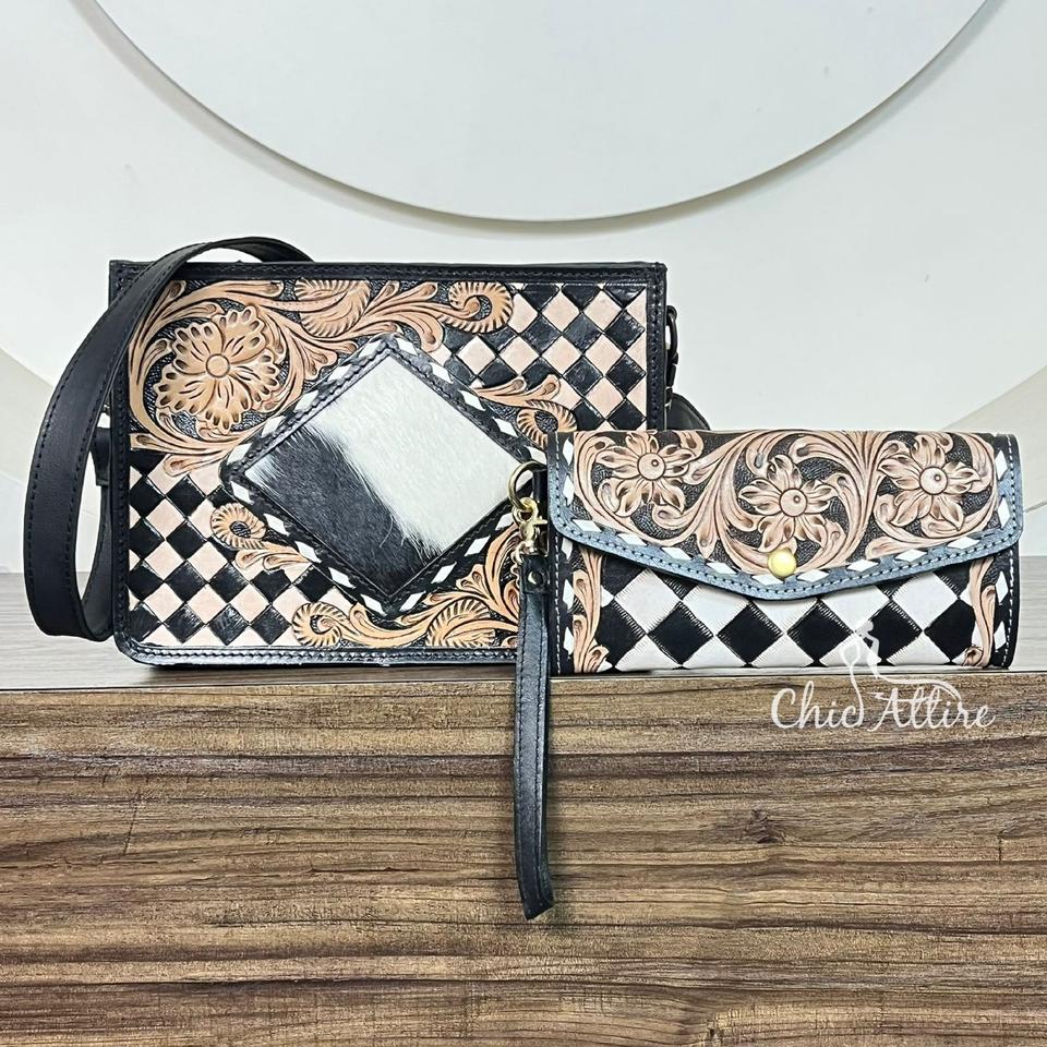 Hot Selling Hand Tooled Genuine Leather Checkered Crossbody Bag With Wristlet Clutch Set Stylish Two-Piece Combo Set for Women's