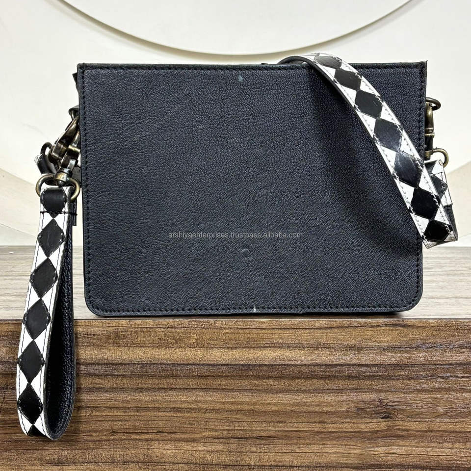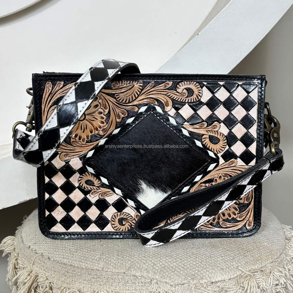 Hot Selling Hand Tooled Genuine Leather Checkered Crossbody Bag With Wristlet Clutch Set Stylish Two-Piece Combo Set for Women's