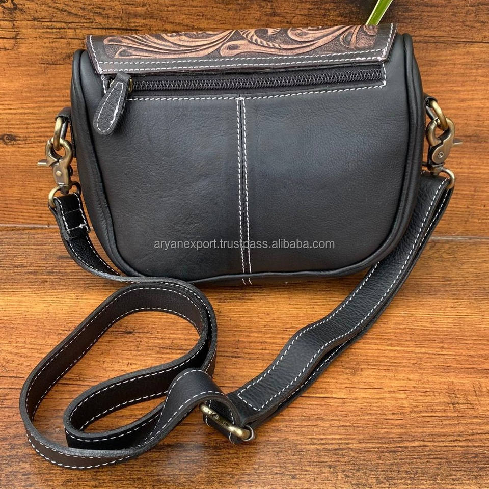 Hot Selling Hand Tooled Hair on Genuine Leather Women Crossbody Bag High Quality Black Floral Cowhide Luxury Western Purse
