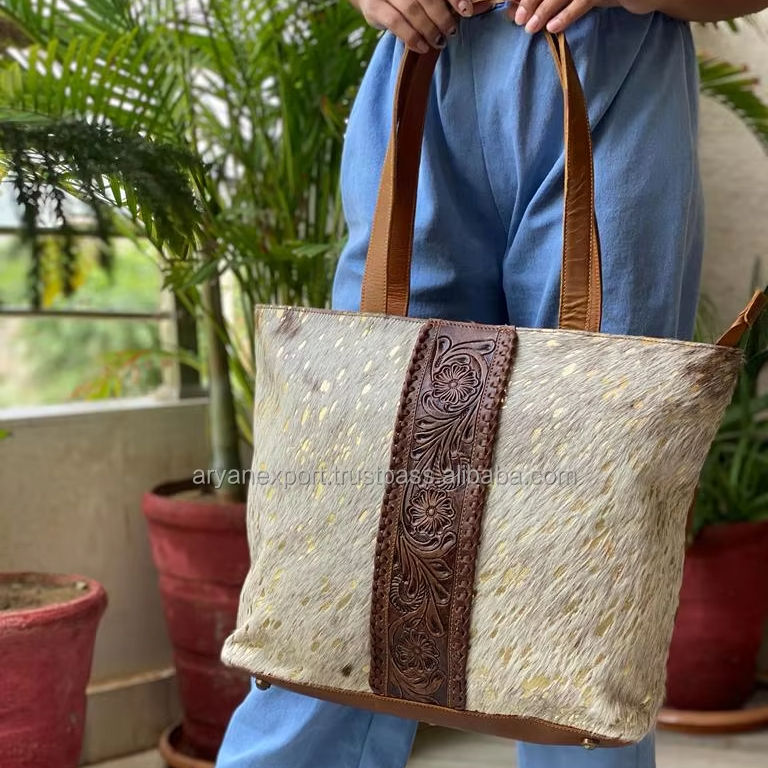 Hot Selling Hand Tooled Leather Women's Tote Bag Designer Hair-on Metallic Cowhide Leather Handbag Genuine Leather Shoulder Bags