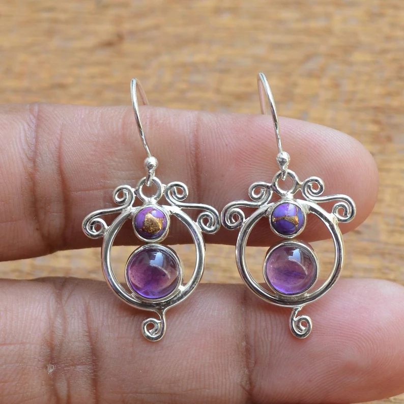 Hot Selling Handmade Amethyst and Purple Copper Turquoise Round Gemstone Drop Dangle Earrings Wholesale Price Jewelry