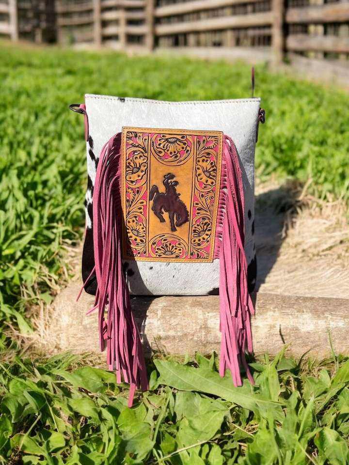 Hot Selling Handmade Cowhide Fur Tooled 100% Genuine Leather Fringe Vintage Bohemian Summer Lightweight Sling Crossbody Bag