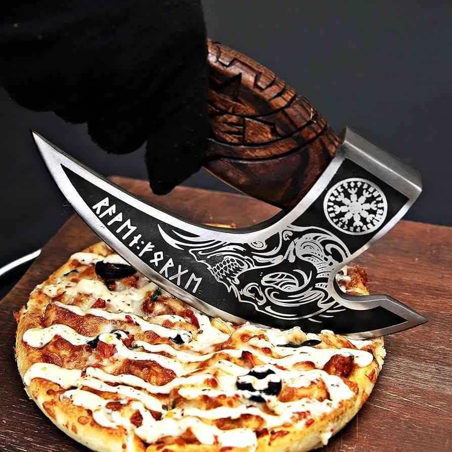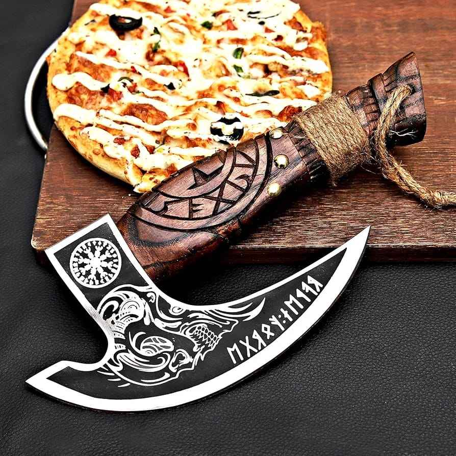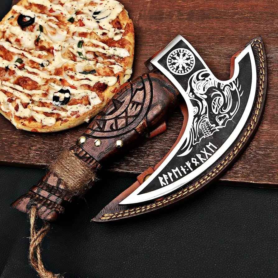 Hot Selling High Quality Hand Forged High Carbon Steel Pizza Axe Viking Style Cutter Wood Etched Leather Sheath for Slicing