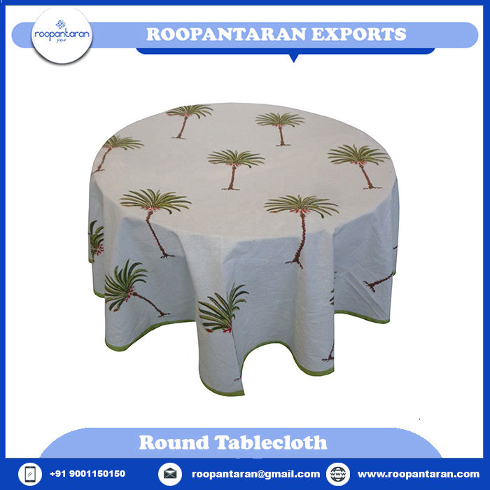 Hot Selling Indian Kamal Aqua Floral Cotton Tablecloth Handmade Open-Hand Block Print for Round Tables
