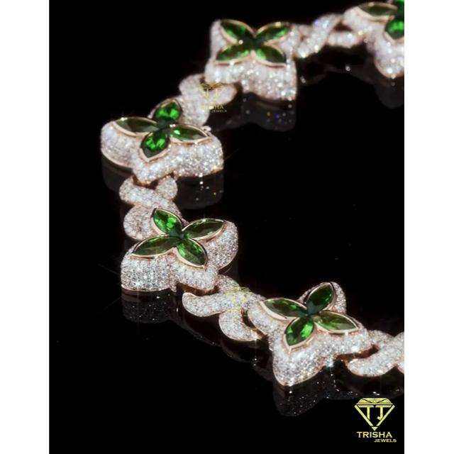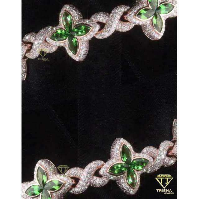 Hot Selling Lab Grown Green Flower Link Chain Rhodium Plated 925 Silver Iced Out Custom Hip Hop Statement Jewelry