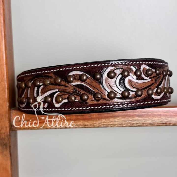 Western Hand Tooled Leather Gold Studs Dog Collars
