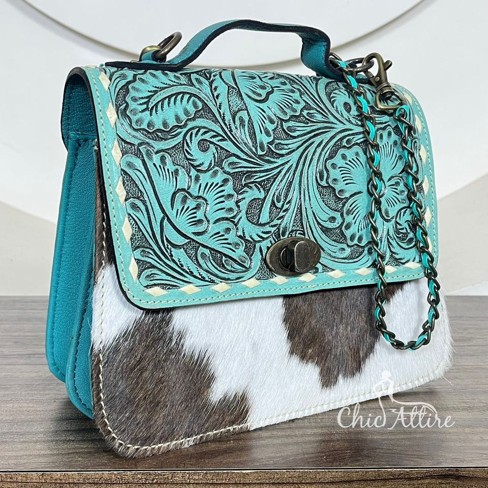 Hot Selling Latest Western Design Hand Tooled Cowhide Leather Crossbody Bag with Chain Strap Handmade Leather Purse for Women