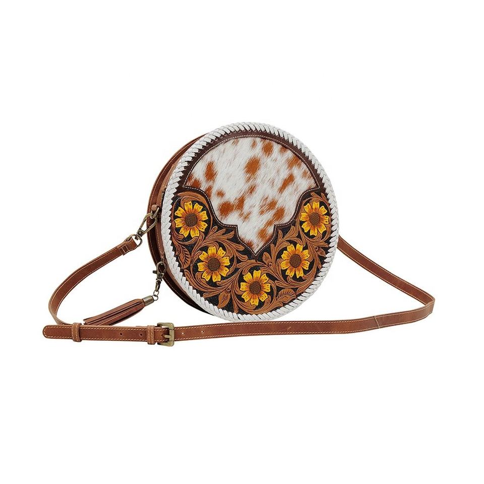 Hot Selling Leather Sling Bag Hand Tooled Round Handbag Designer Women Carving Leather With Hair on Shoulder Bag for Women